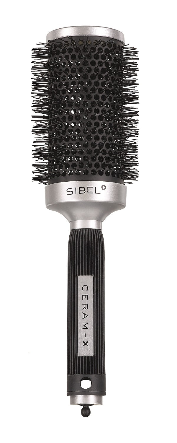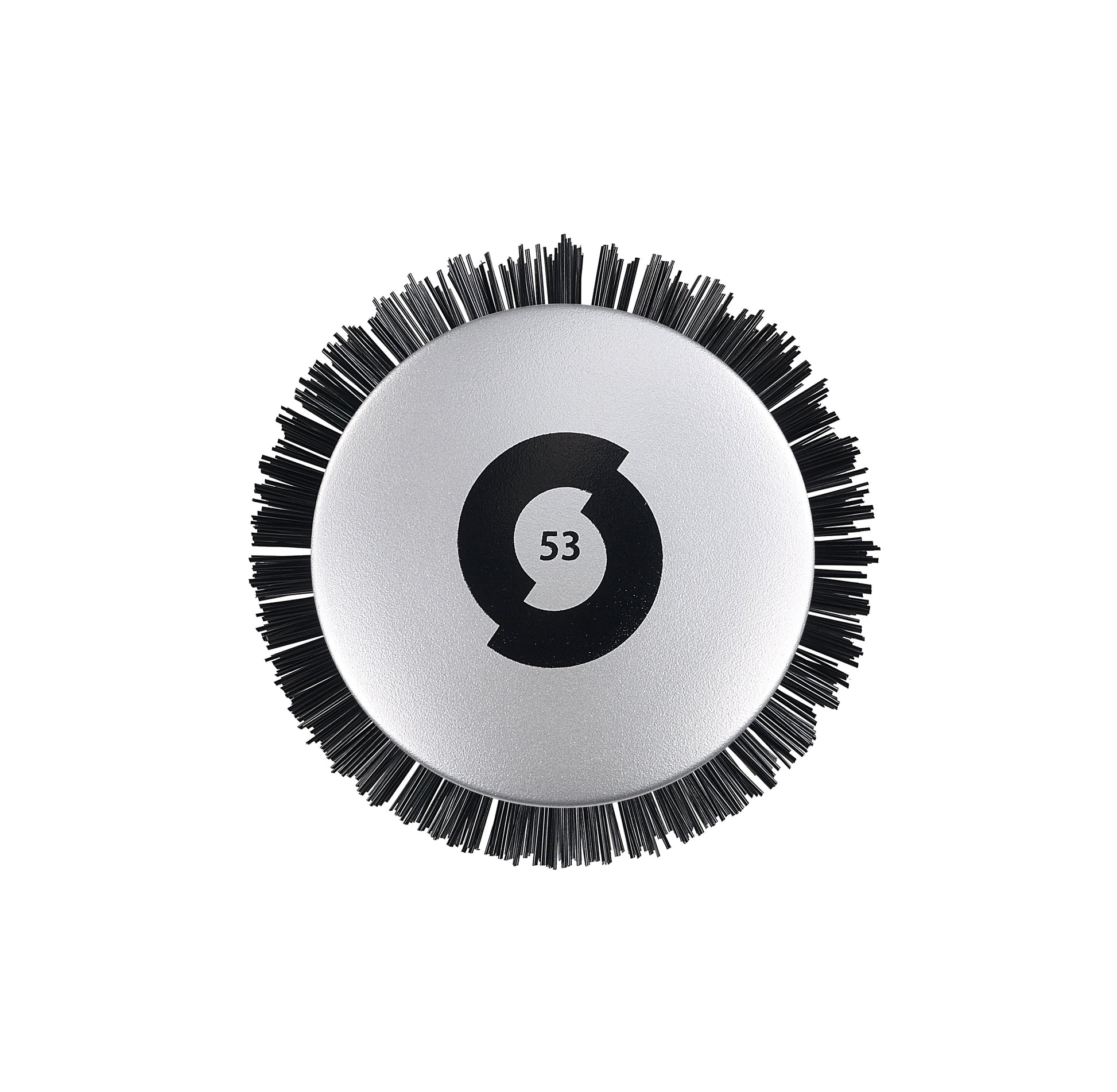 The Ceram-X 53 brush features a unique ceramic barrel that is half covered with boar and nylon bristles and half uncovered. The ceramic barrel without bristles actually functions as a curling iron, as it holds the heat during the brushing and transfers the heat back to the hair for a faster and more efficient styling. The combination of nylon and boar bristles hydrates the hair cuticles and adds a wonderful shine to the hair. The special grip handle has an anti-slip function and holds a sectioning pin.